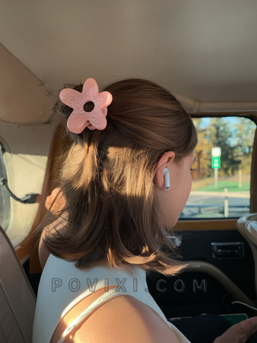 This look blends practicality and charm with a fun, oversized plastic flower clip in a soft coral hue securing a half up twist. It’s perfect for hot afternoons when you want your hair out of your face without sacrificing style. The glossy finish on the clip reflects sunlight beautifully—ideal for summer drives or patio hangs. This quick easy look is a no-fuss favorite, especially for those who appreciate a feminine touch with natural waves. Pair it with a white tank or sundress for a timeless sunny-day vibe.