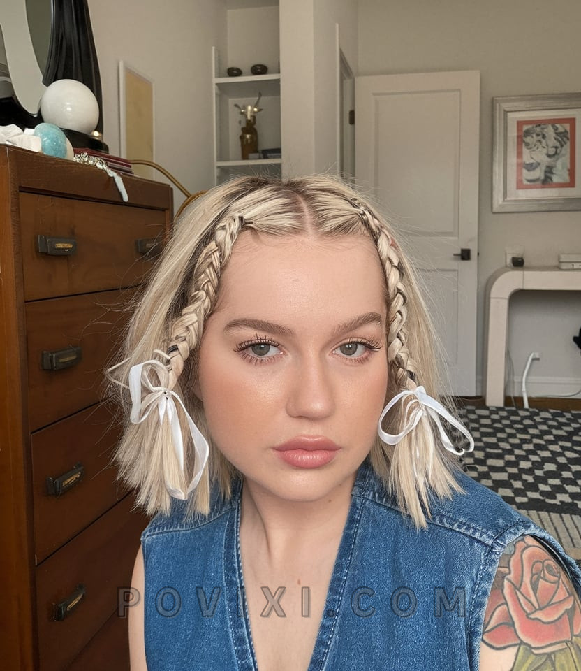 Two tight braids, tied off with dainty white ribbons, create a sweet and slightly nostalgic vibe. This style channels major kids-core energy, but the grown-up execution makes it cute and wearable for any age. It’s especially flattering on highlighted blonde bob styles, and works wonders for second-day hair. Toss on a denim dress or vintage tee to round out the retro-cool look. Great for a picnic, or even a summer concert.