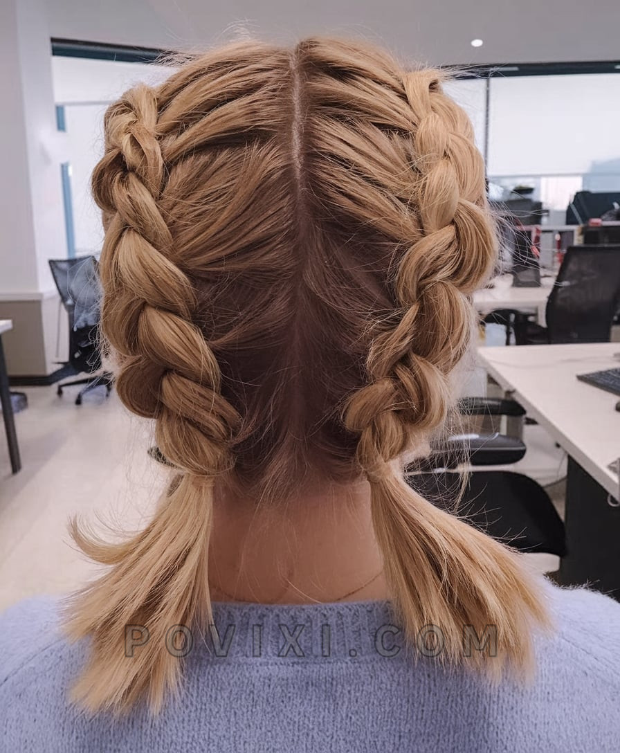 These chunky braids bring a sporty yet feminine edge to short hair. Split into two sections and braided down the back, the look keeps your neck cool and your vibe fun. A fantastic choice for kids, teens, or women who want a quick and secure hairstyle for active days or even festival weekends. Add a mist of sea salt spray before braiding for added grip and beach-ready texture.