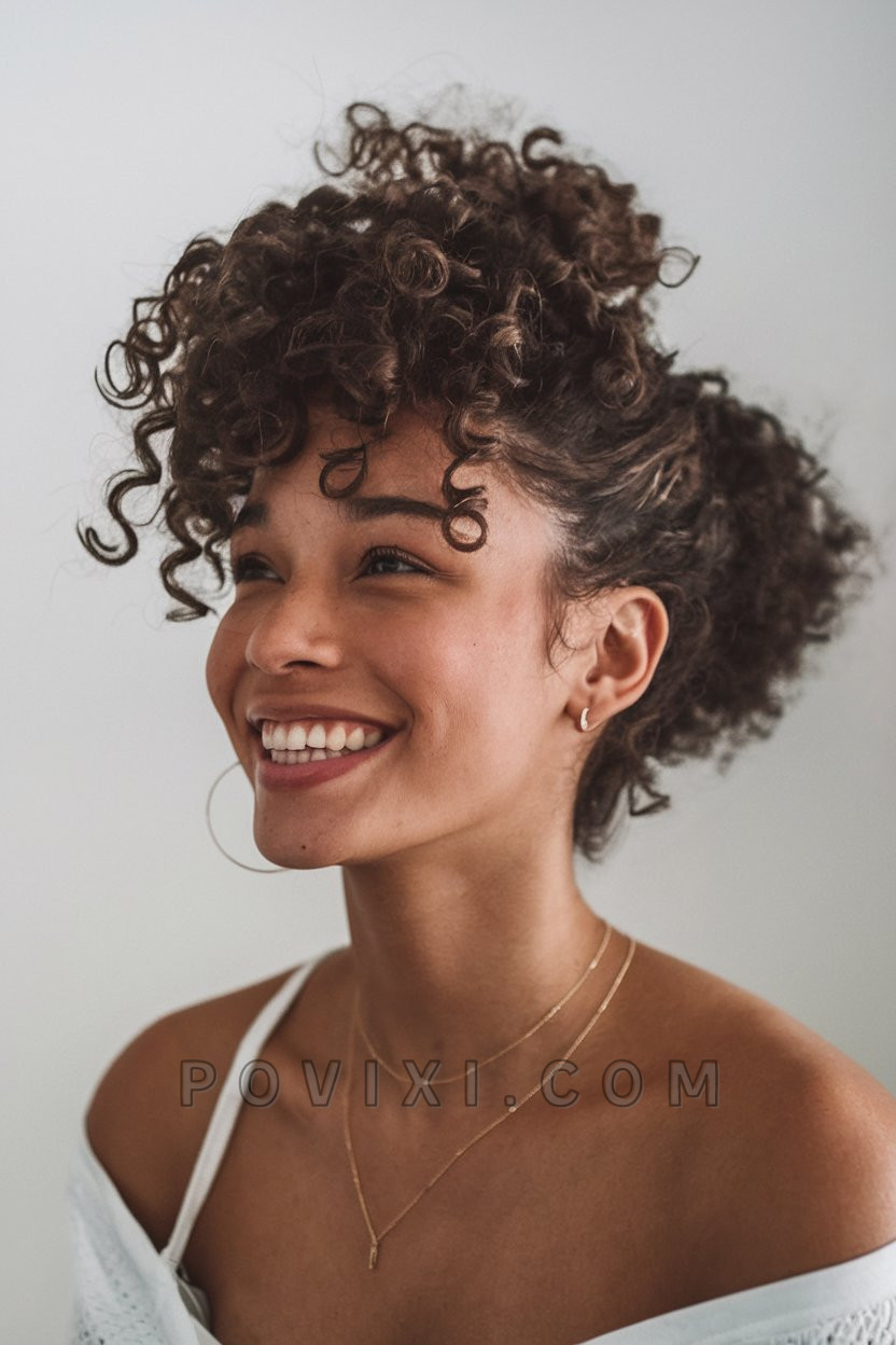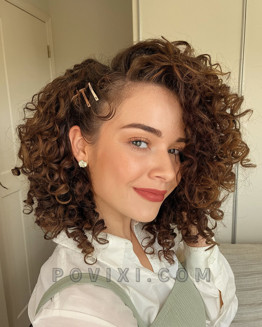 This curly hairstyle features volume, bounce, and a playful side part secured with silver bobby pins. It’s the ultimate look for embracing your natural texture in a structured yet fun way. Great for office days, brunch, or a low-key date night. It also works beautifully over 50, as it’s both youthful and timeless. Use curl cream for defined spirals and let those coils shine.