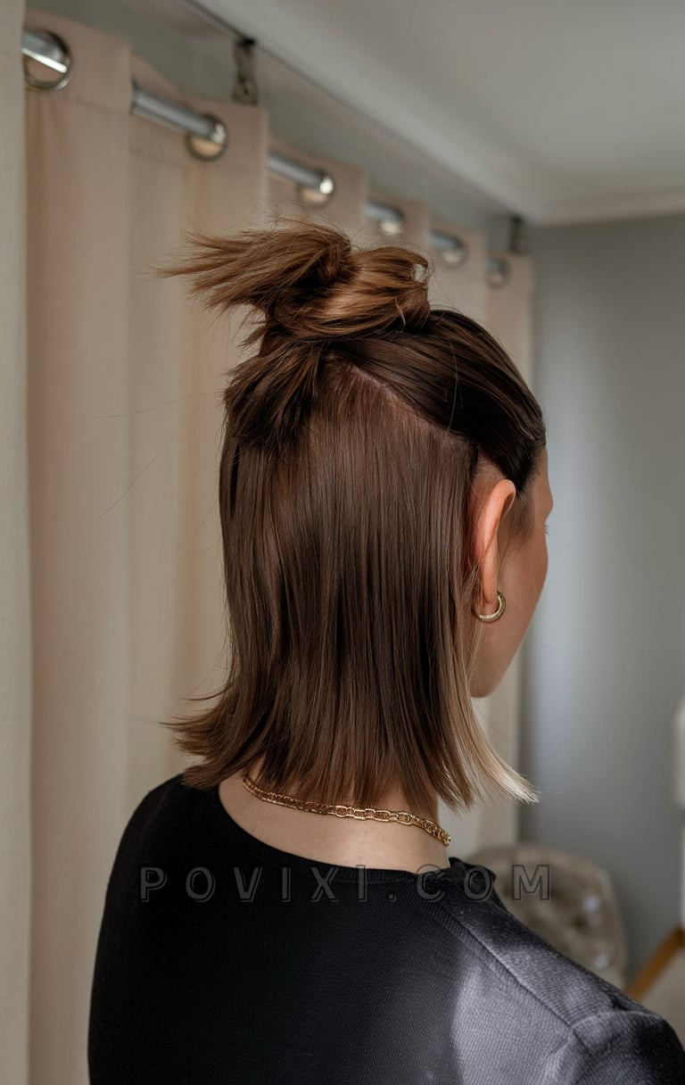 Minimalism gets a twist—literally. A cleanly knotted half up bun over sleek, straight lengths gives this style a modern, editorial feel. Perfect for office days or coffee runs, this look is quick, simple, and surprisingly versatile. It’s especially flattering on sharp bobs or blunt cuts, adding an element of edge to your summer rotation.