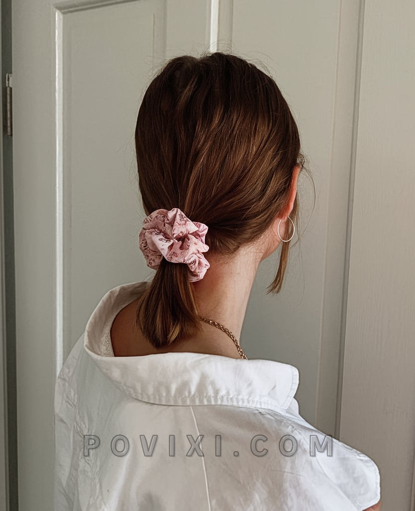 Sometimes, all you need is a soft scrunchie to create a polished casual look. This low ponytail brings together ease and charm, thanks to the fabric texture and subtle pink hue. Pair it with a white linen blouse and dainty gold jewelry for that “I just got back from the Hamptons” vibe. A perfect quick easy fix for work-from-home days, summer errands, or even Sunday brunch.