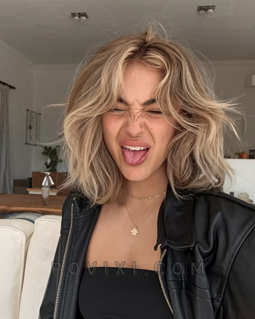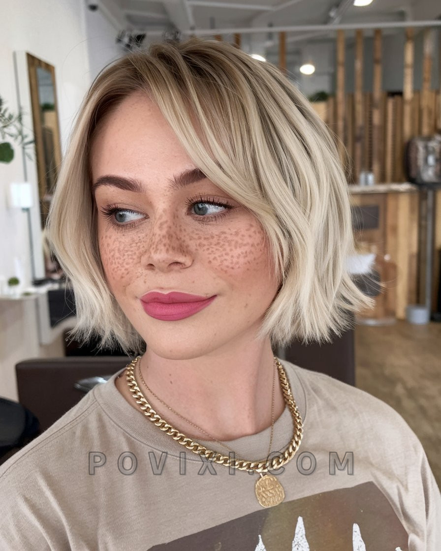 This softly tousled bob is giving 2025 energy. The side-swept bangs frame the face beautifully, ideal for softening angular features or adding dimension to rounder face shapes. The buttery blonde tones feel bright and fresh—just like summer should. This look is quick easy to style with a little salt spray and finger scrunching. Whether you’re headed to a picnic or brunch with friends, this fun, laid-back cut feels polished without trying too hard.