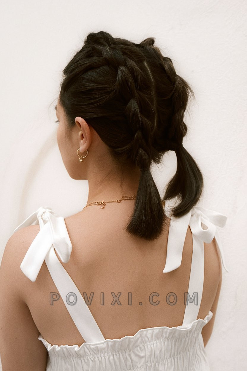 A pair of thick, Dutch braids pulled into low pigtails make this look ideal for high-energy summer days. Whether you’re biking by the beach or running errands with kids in tow, this style keeps things in place and still feels casual and chic. The texture and structure flatter short hair, and it’s one of the best quick ways to feel put-together and playful.