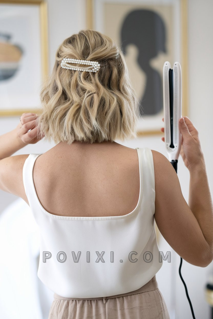 This soft blonde bob style gets a polished upgrade with a gorgeous pearl-studded clip holding a half up section. It’s giving “modern vintage”—effortless yet elegant. This look is versatile for any summer occasion, from garden parties to wedding guest appearances. Best of all, it’s quick easy to recreate with a curling wand and a statement barrette. Pro tip: Add a spritz of texturizing spray for hold without stiffness.