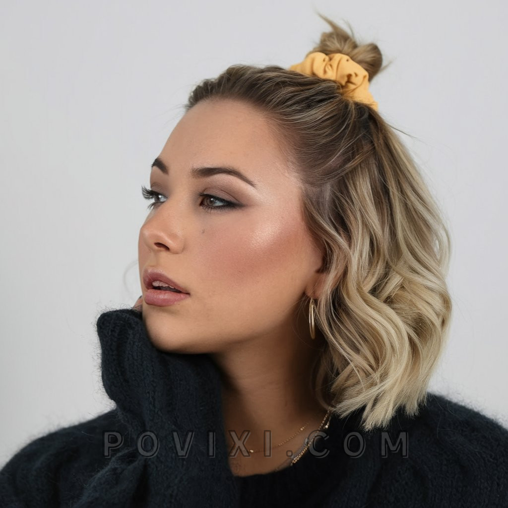This quick easy style uses a sunny yellow scrunchie to secure a half up mini bun on soft blonde waves. It’s ideal for mornings when you’re heading out the door but still want to look put together. A great casual hairstyle that transitions easily from errands to casual meetups. Choose a bright scrunchie for summer vibes, or go neutral for versatility.