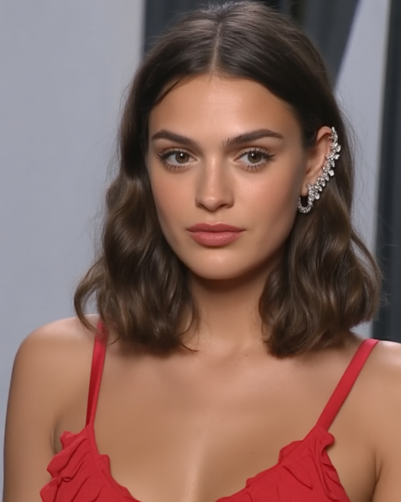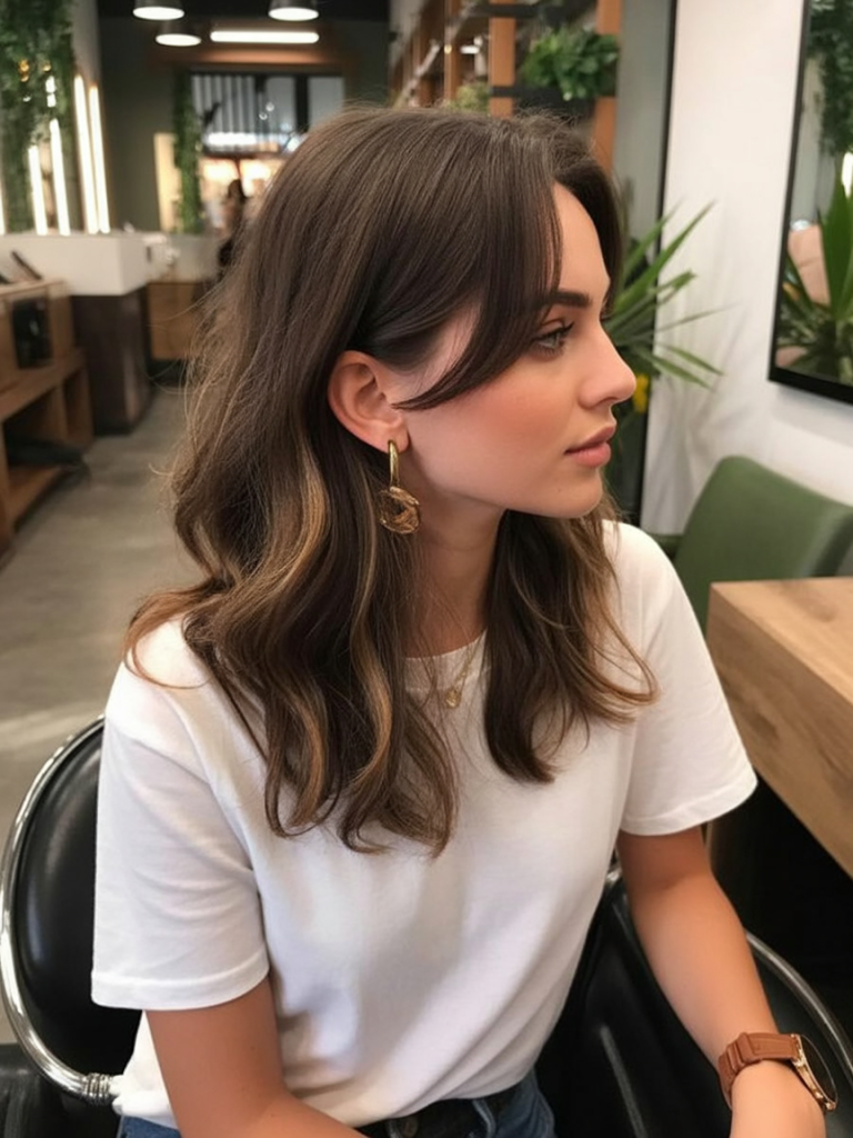 Brunette shoulder length waves have a natural beauty that radiates style and ease. The soft gentle waves create an over-all relaxed yet polished effect. That is one of the cuts that fit practically every environment, and whether you are meeting up with your friends or going to a business appointment, it will work.