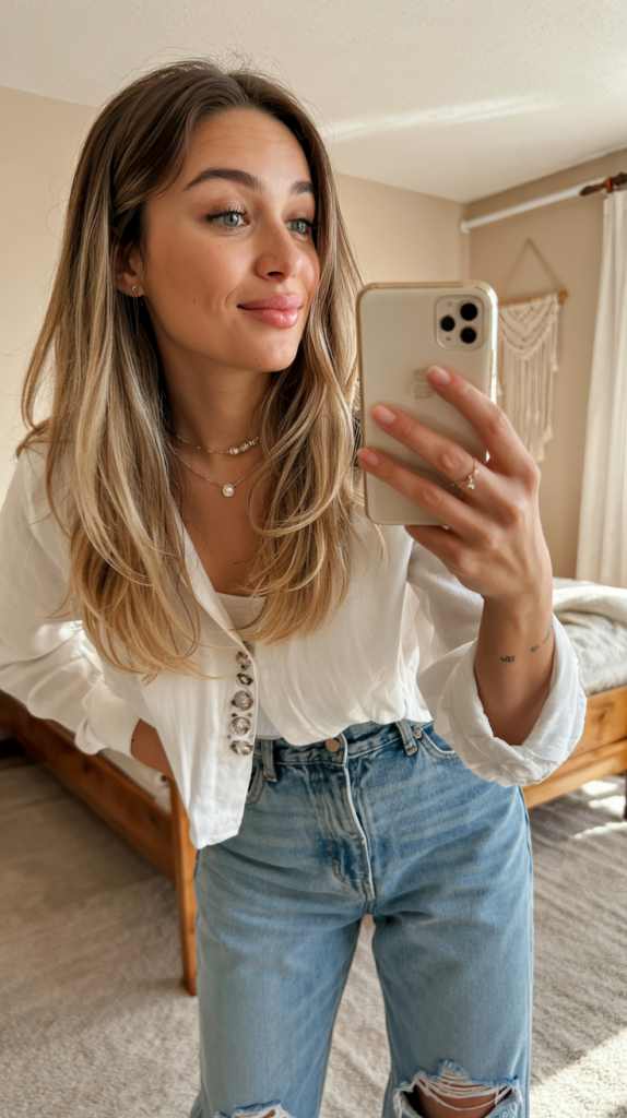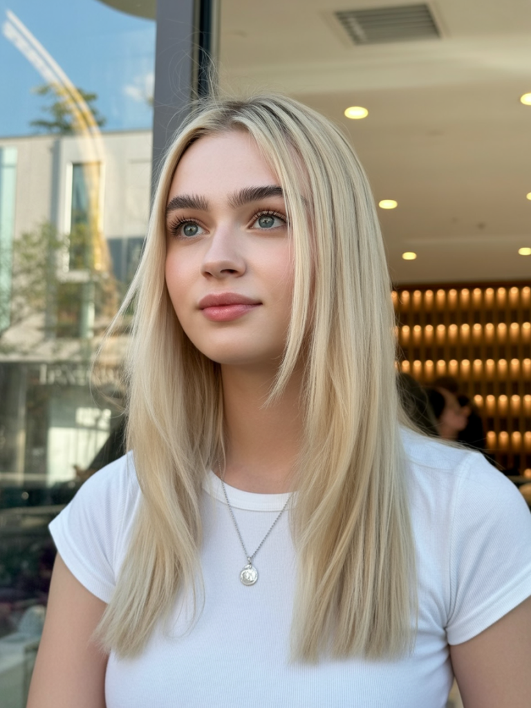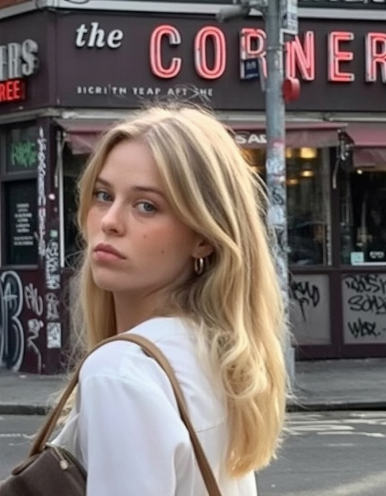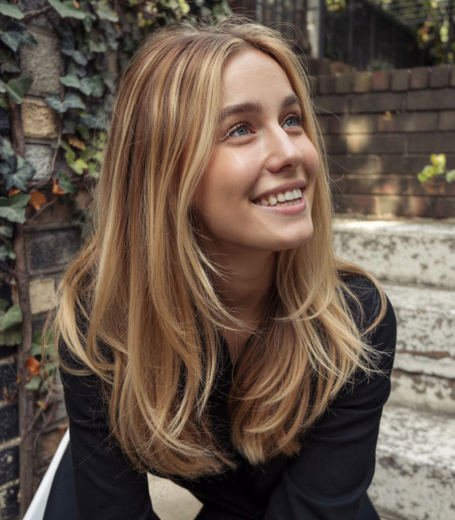 Natural-looking blonde hair with the perfect amount of layering is so chic: it can feel timeless and carefree. It is simple, which makes it European, elegant, photos of a lady in a city street in a blouse and jeans. It’s polished without ever trying too hard.