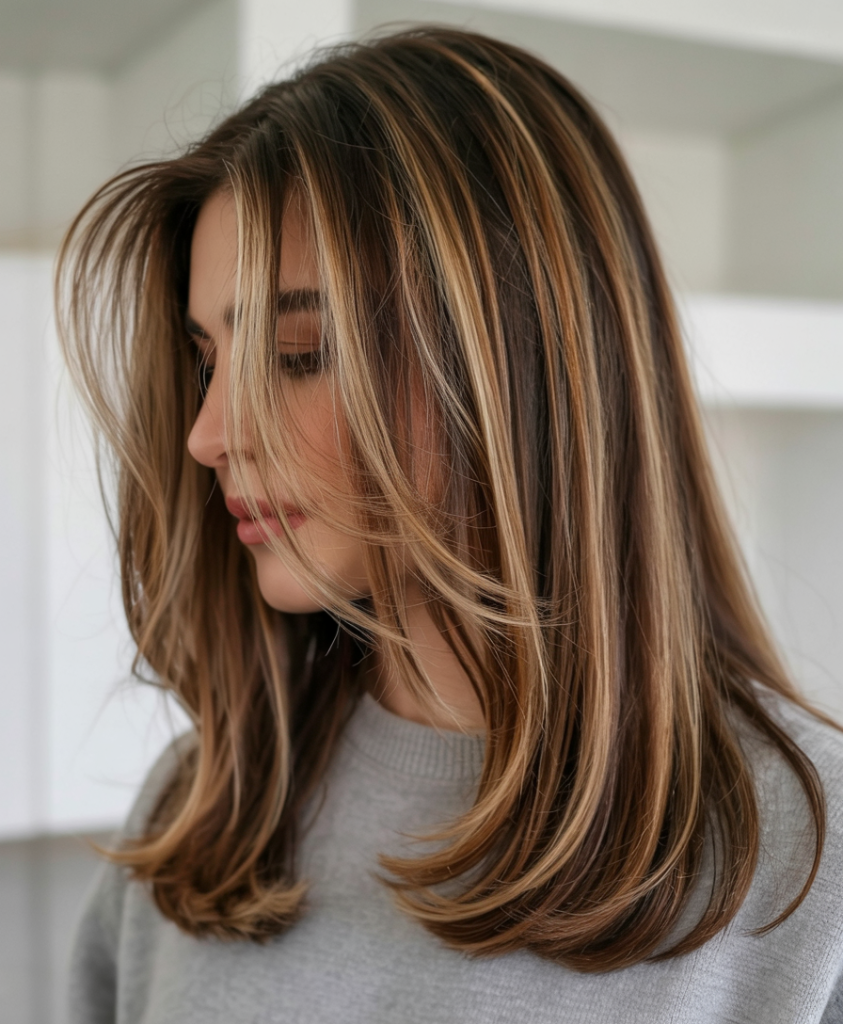 It enhances thin fine hair exceptionally because it helps the hair to look fuller without having to use heavy products. The shorter layers get raised at the crown and the longer lengths get more elegant. This medium long type is wonderfully combined with fashionable women when they need more volume and shine to their hair and in summer the light highlights will make the style even more visible.