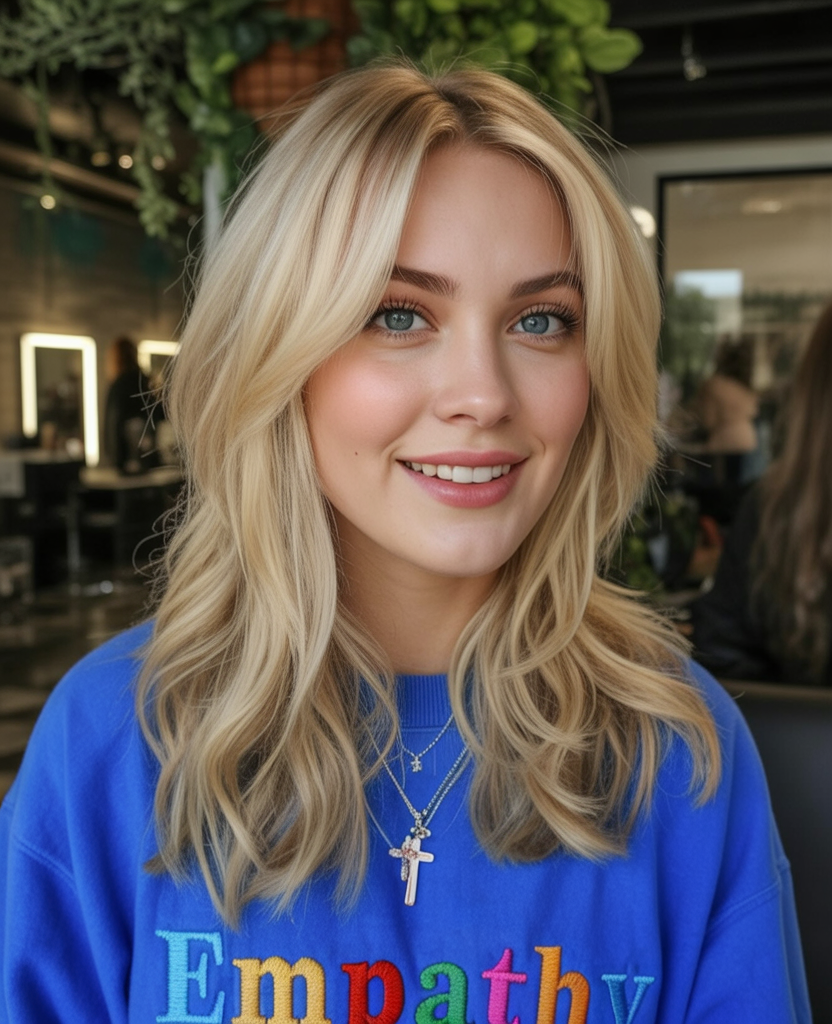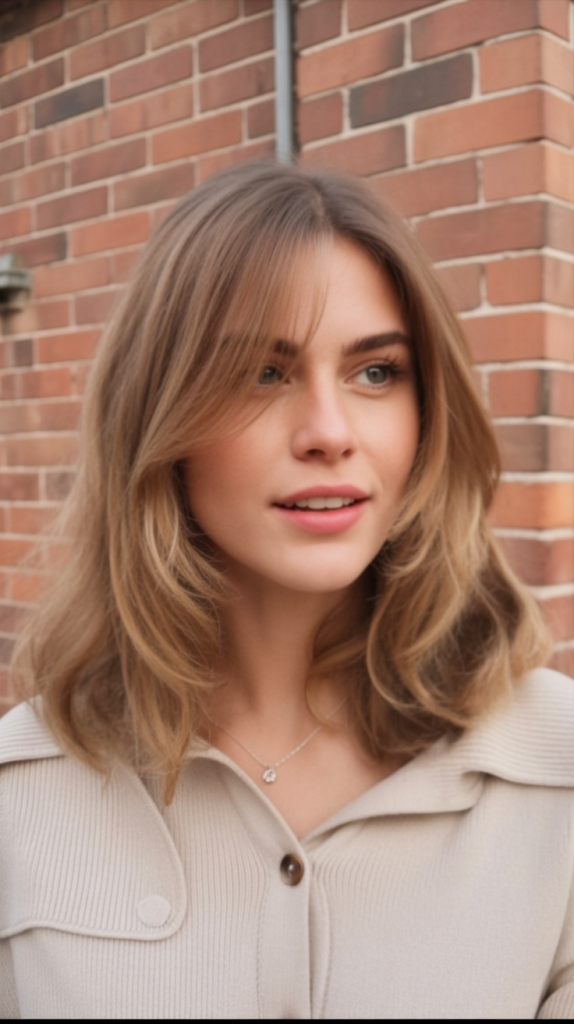 Soft curtain curved bangs, middle length layered blonde hair together create a touch of nature with modern outer personality. The style softens the face and provides flow all over the face, which makes it look graceful yet friendly. It is the sort of cut that instantly makes you feel pulled together.