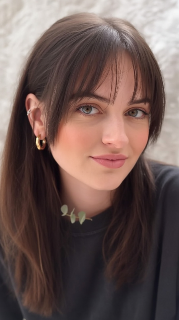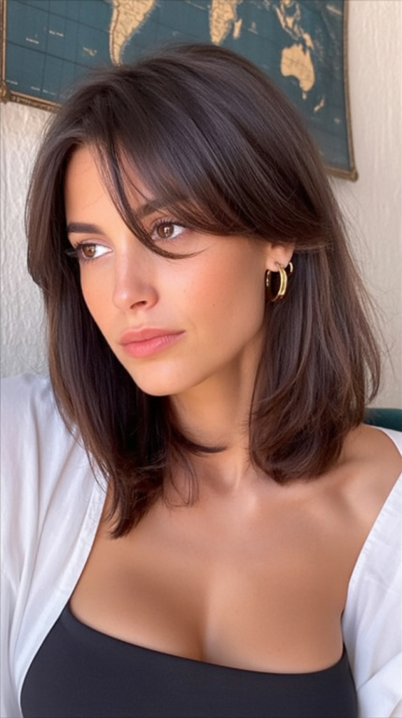 5. Sleek Mid Length Cut with Wispy Bangs