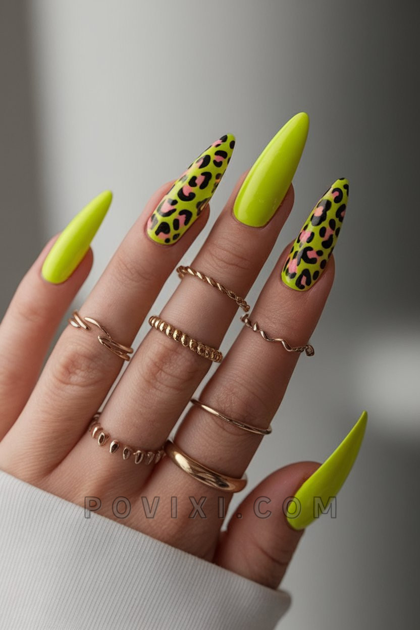 A funky combination of electric yellow and wild leopard print presents an unapologetically bold look to the world. White high-gloss finish on elongated almond nails enhances the vibrant look of neon gel nails, and leopard spots in black and pink shades add a fun dimension to the ensemble. This design purposefully expresses individual strength for public parties and music festivals. The editorial fashion look is achieved by pairing this creation with white shirts and gold rings.