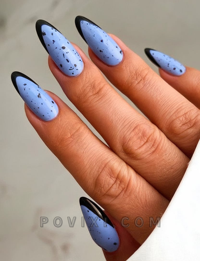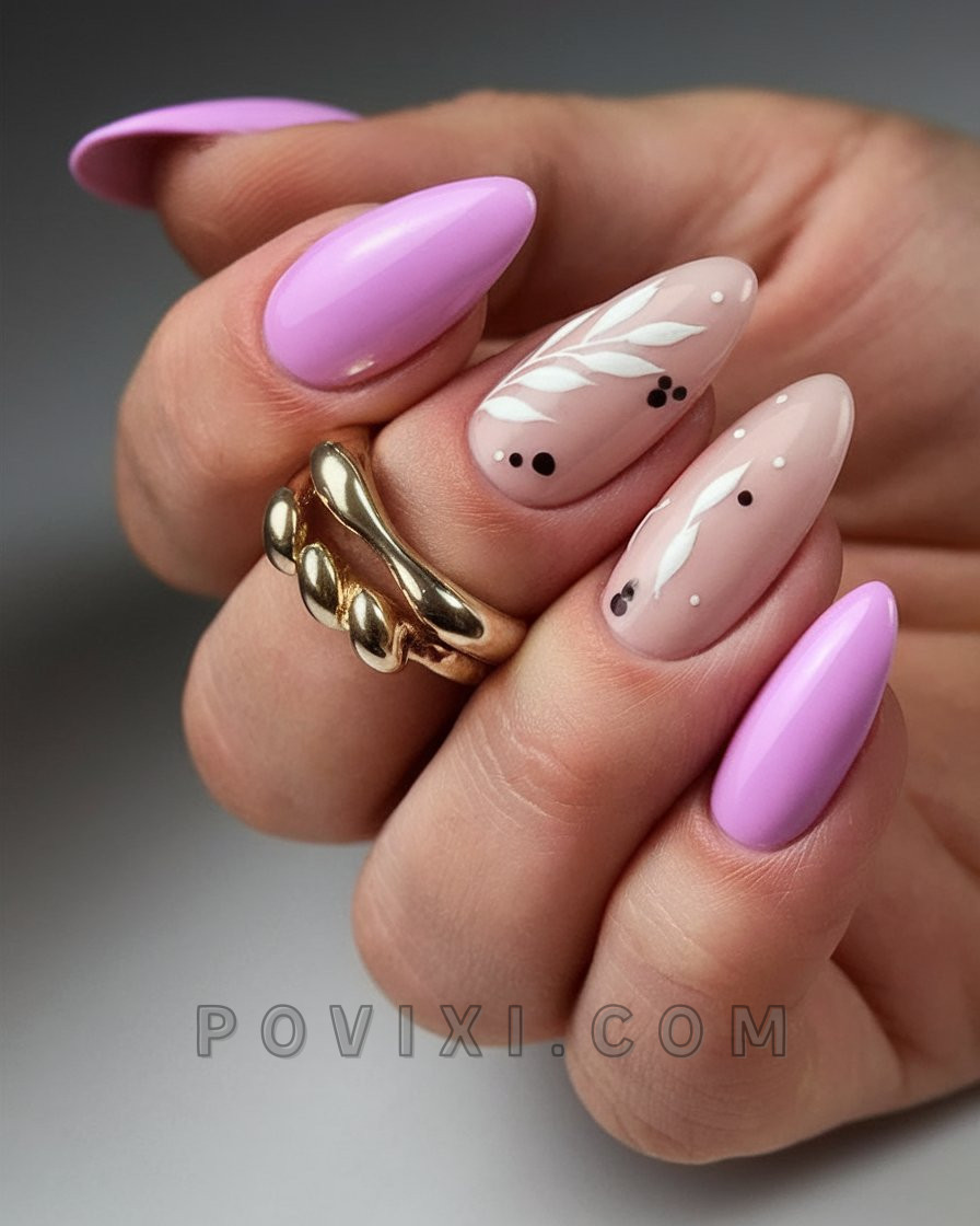 A minimalist look can be remarkably chic. This 2025 almond nail design alternates between pale lavender tones combined with a natural looking base that is decorated with delicate white leaves next to delicate black dots. Anyone who enjoys modern, natural nail styles will enjoy this refreshing design. This ensemble instantly creates a street style look when paired with an oversized blazer and denim shorts.
