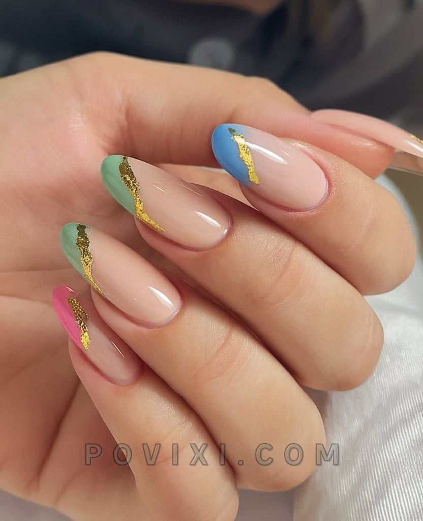 The sophisticated version of a French Tip consists of pink with blue underneath and green above each nail, finished with coral at the tips, while gold foils draw attention to the color separation. The special touch comes from the thin gold foil design elements that create distinct boundaries between the base colors and transparent areas, like the glow of sunlight on ocean waves. This elegant design works well on both natural and gel nails while maintaining a playful aesthetic. Pair this look with a white blouse and delicate gold jewelry for an elegant summer style.