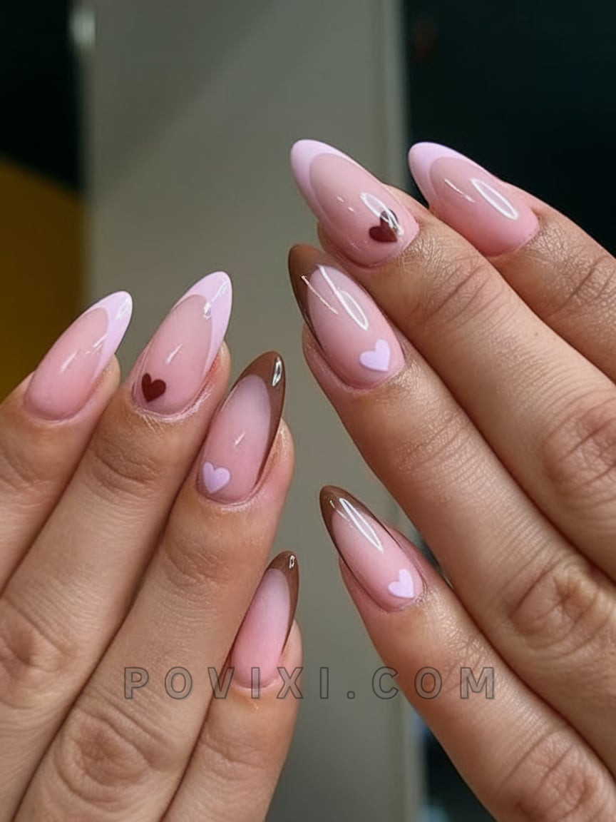 The dessert-themed French Tip concept features playful elements combined with sweet colors. Pieces of pastel hearts sit on alternating pink and brown nail tips resting on natural beige nails. The combined elements combine cuteness with a sophisticated summer romance sensibility to create a distinctive summer aesthetic. The short sundress and picnics in the park go perfectly with this design when complemented with heart-shaped sunglasses and vintage scarves.