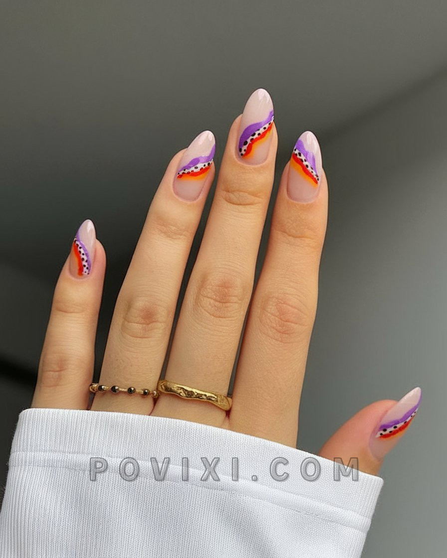 The swirl visual aesthetic creates a retro ’70s charm by combining fiery orange, pink and lavender color elements with dotted lines. Your natural nail can appear between the colors as these areas create spaces that help make this design modern and appropriate for everyday wear. The nail version of going barefoot to a music festival while wearing a crochet top and layered necklaces creates this fun and vibrant style.