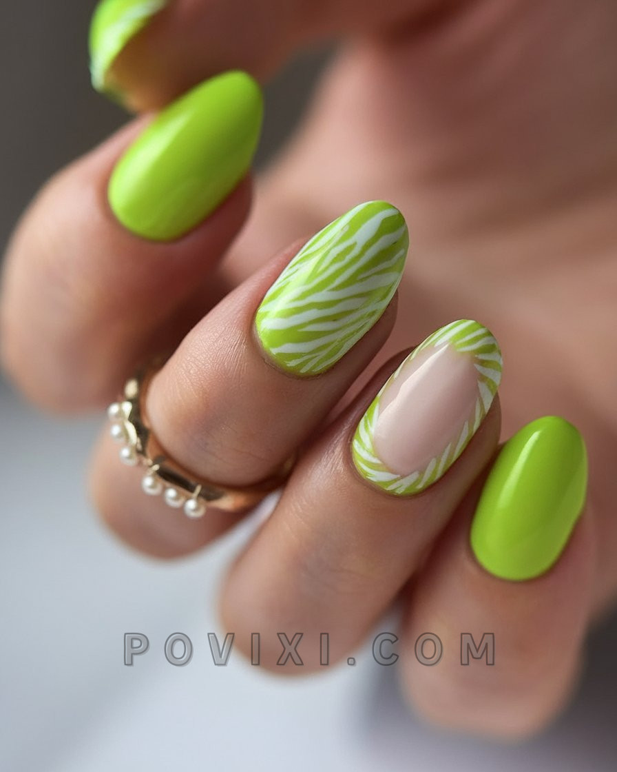 The ultra-modern presentation of this bold color gel nail design is ready for display. A lime green base is accented with zebra-inspired accents that harmonize with minimalist cut-out details. Made for people who want to show off their nail style with unique designs, this will feel right at home in 2025. The sleek ponytail paired with sporty neutrals creates the best visual contrast to these lime green nails.