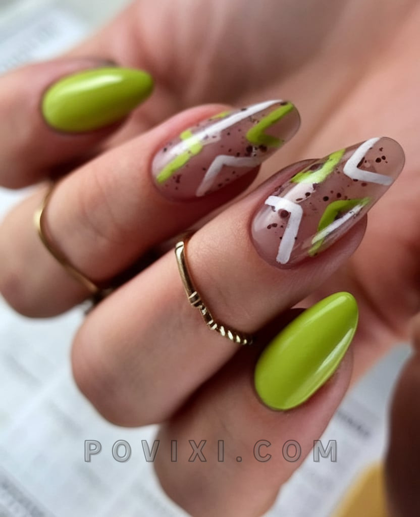This cool yet uncomplicated look combines olive and lime color elements with straight white geometric shapes using transparent nail bases. This nail style features an editorial and edgy design that appeals to trendsetters who prefer either chip-resistant or acrylic artificial extensions. The utility jumpsuit along with structured linen sets work perfectly to style this particular look.