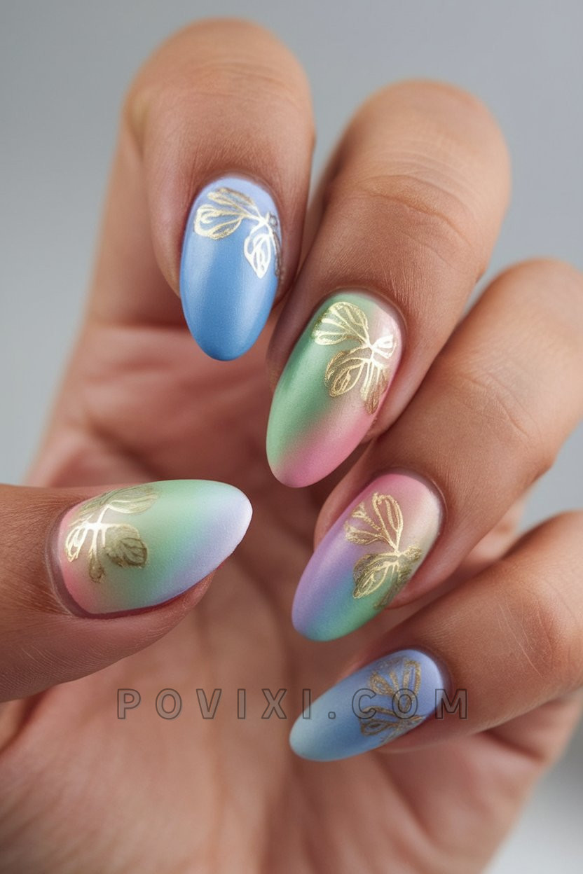 Let’s talk dreams. Divided into a pastel spectrum of soft colors, this matte-finish design features tiny golden butterfly embellishments. The style looks sweet and ethereal and works with natural nails as well as long gel nails. A garden tea party needs this pastel color combination of blue with mint and lavender. Complete this fantasy with floral accessories and fantasy jewelry.