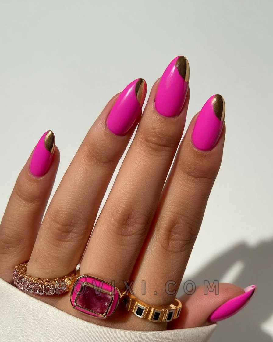 Make a statement with this striking 2025 pink and chrome gold reverse French tip design. This bold magenta nail base stands strong, but its shiny gold accents add a sophisticated shine to the ensemble. If you want to stand out at night, this special manicure is the perfect evening choice. The shiny design look can be complemented with gold hoop earrings along with metallic heels.