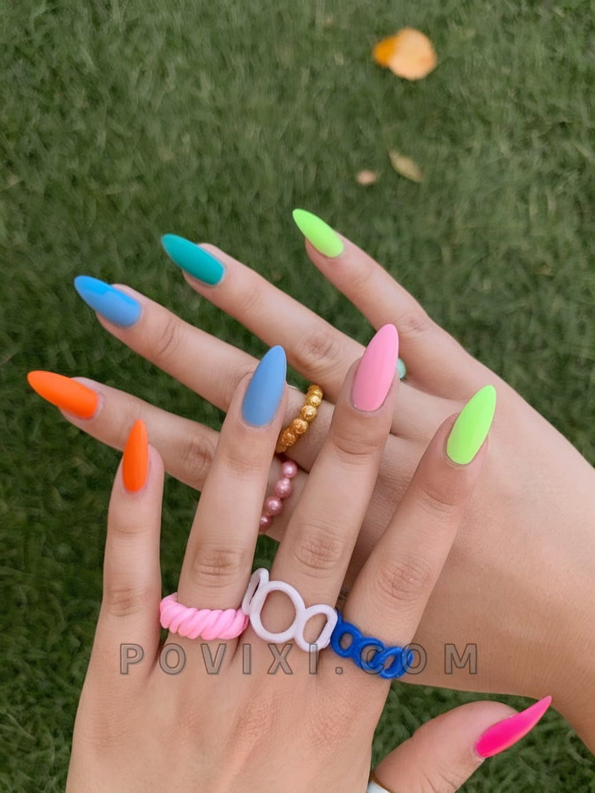 A matte rainbow set provides an instant energizing serotonin boost when you need bright, happy colors. The different rainbow almond nails feature blue, followed by coral, then finish with lime green for a natural, artistic style that looks cute. This basic 2025 nail design creates a youthful and active look, while also serving as a simple background for your next Instagram post. For a Y2K-style outfit, pair this manicure with colorful plastic rings and a casual t-shirt.