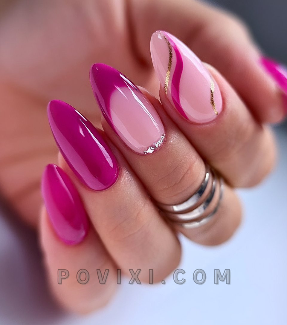 A bold pink manicure with high gloss completes a fashionable 2025 trend. The almond base is accentuated by the solid fuchsia color, while the inner abstract swirls filled with gold foil and silver shimmer create negative space effects. Its dual appearance of elegance and strength makes this design the perfect complement to satin summer dresses and metallic accessories.
