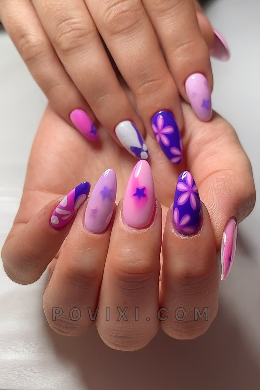 This nail set features a variety of purple and pink flowers in an eclectic 60’s style. The acrylic nail designs incorporate colorful block patterns along with open areas for an energetic, youthful aesthetic. The nail set delivers a carefree festival or backyard barbecue style with its upbeat design. The nails complement vintage jeans and halter tops as well as floral print skirts.