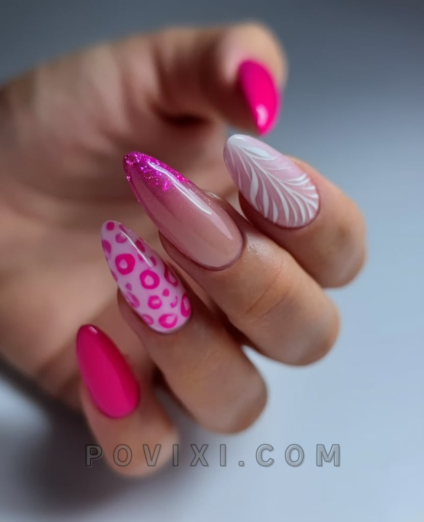 This set uses creative gel nail techniques to create a cohesive pink-themed masterpiece consisting of different nail styles. This manicure layout demonstrates elegant mismatched nail design possibilities through its collection of hot pink solid nails combined with glitter effects and leopard designs and mini leaf accents. The manicure creates the ultimate summer feel that can be paired with a cropped top and dramatic lipstick.