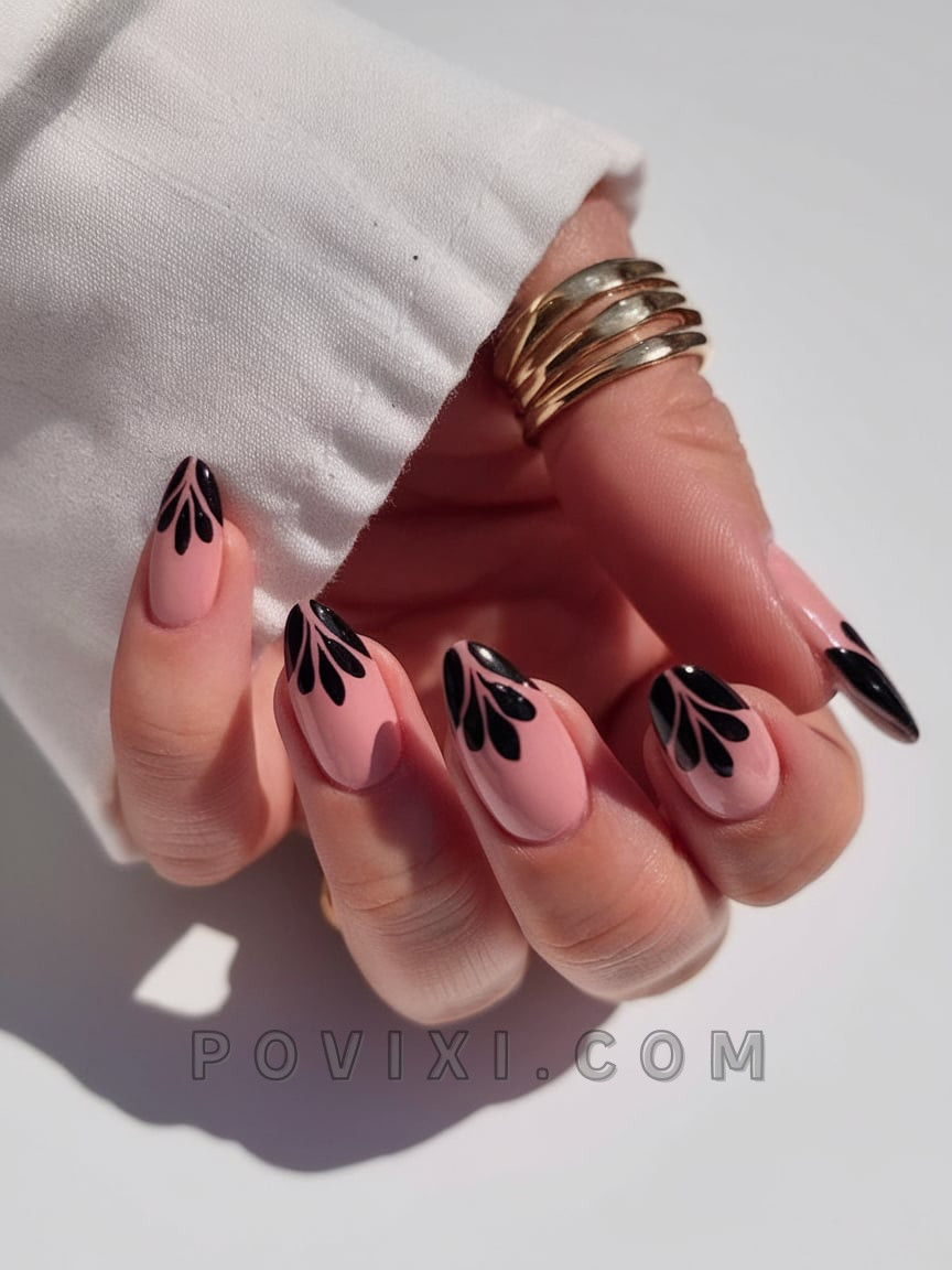 This sophisticated mani design utilizes glossy black petal motifs that rest on matte blush bases to create an undeniably striking look. Each almond nail features a contemporary floral design for a clean and sophisticated aesthetic. The black and white color scheme along with gold jewelry creates a minimalist look suitable for fashion enthusiasts.