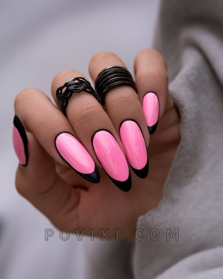 This stylish nail design blends a bubblegum pink style with a sleek black outline to create a rebellious take on french tips. The nail design creates a Y2K fusion with futuristic elements, combining nostalgic values with fun and unique style. Gel-lengthened nails are an excellent choice for people who love bold contrasts, as the bold nail designs complement any outfit. For absolute pop power, match the nail look with black clothing.