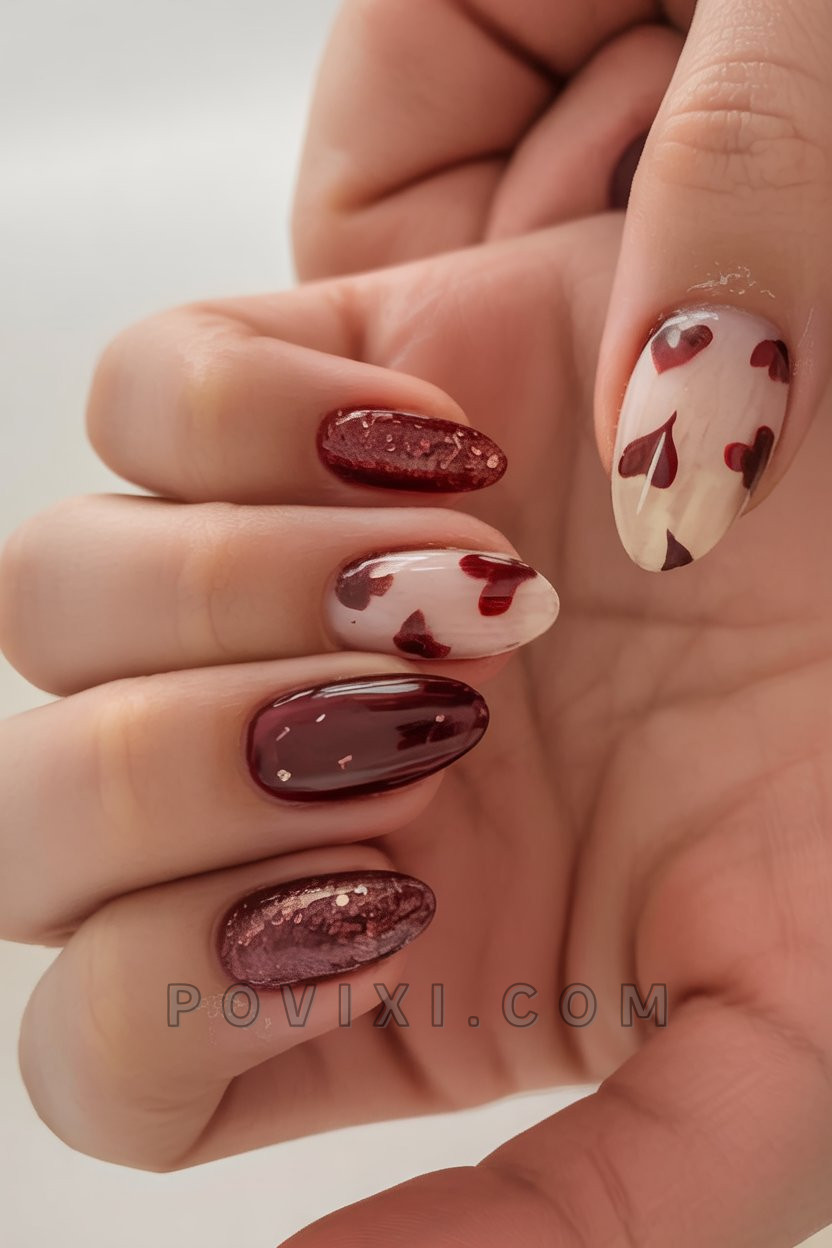 Our collection ends with soft brown hearts on clear nails and velvety shimmer on short almond-shaped nails. Spring and summer elements blend seamlessly in this design to give you the perfect warmth along with the slight sparkle effect. This design suits weekend brunches or early summer date nights when paired with earthy shades or creamy neutrals.
