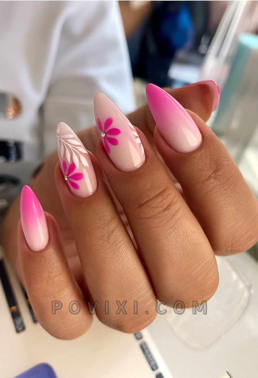 The combination of floral motifs and pink fading effect creates a garden chic design with feminine yet fun elements. A precise application of pale pink daisies with white leaf accents appears on the gel nails to create the perfect amount of pleasantness. Perfect for summer events, this 2025 pink nail style looks amazing when worn with sundresses and casual beach waves.