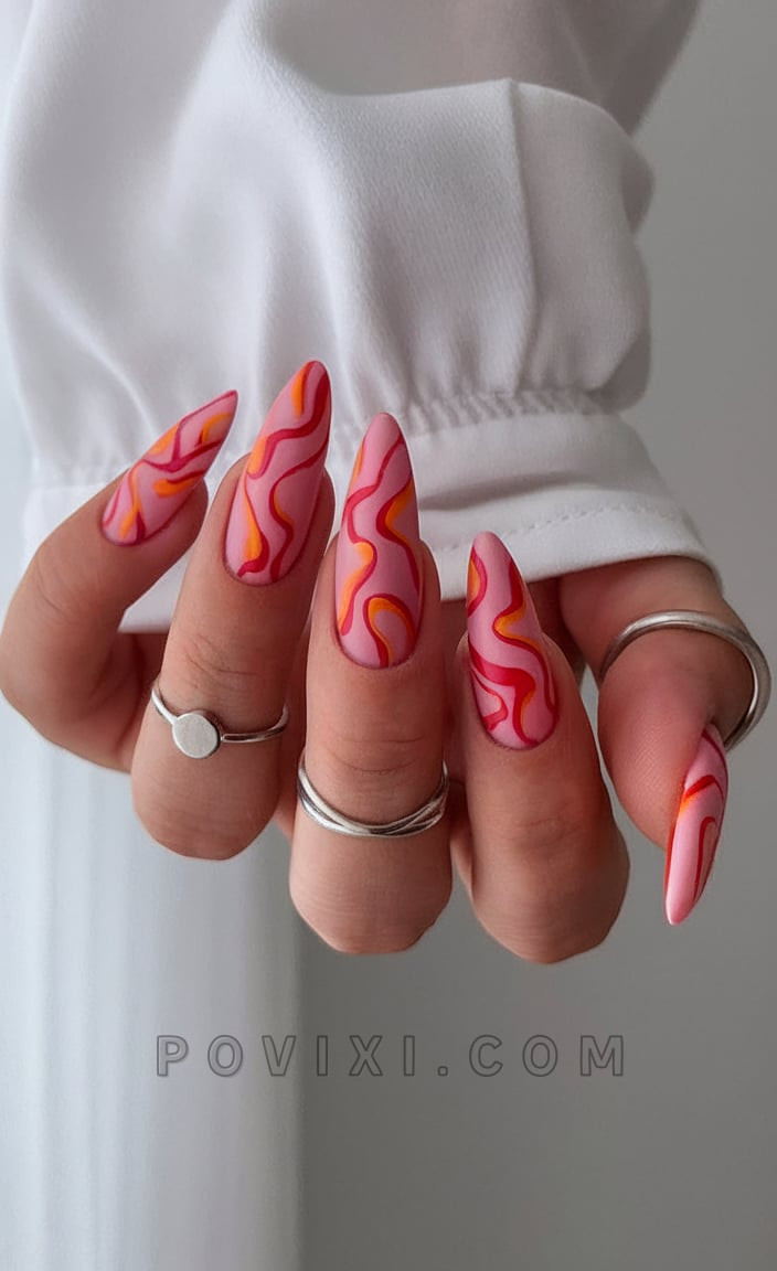 This abstract line design in shades of red, orange and pink brings lava lamp energy with retro elements. The almond acrylic nails have a matte finish for a stylish yet trendy look. The nail style works perfectly as a holiday outfit accessory thanks to white tops paired with flowy pants that create an instant stylish look for anyone.