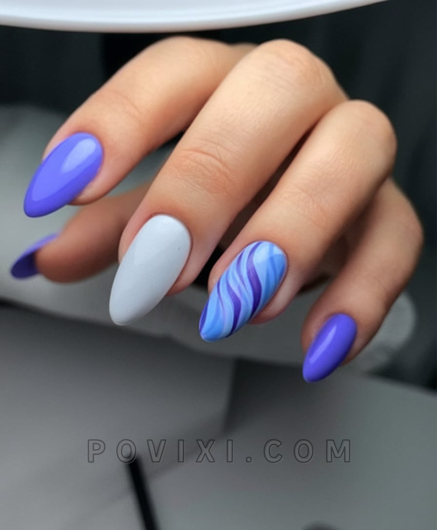 For individuals drawn to light blue and purple shades combined with zebra pattern accents, this minimalist nail design stands out. This nail design features mostly solid colors with just one eye-catching pattern, making it a perfect choice for individuals starting to explore artistic nail options. A combination of pastel clothing and silver accessories works perfectly to bring out this nail look for summer days.