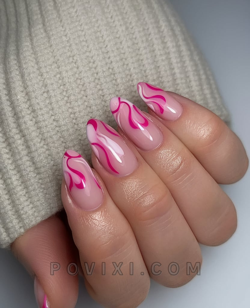 The French tip gets a fashionable makeover as pink flames dance on a nude base throughout 2025. The hot pink flames on these gel nails provide vibrant brightness while maintaining a stylish, wearable style. The slender almond shape extends the length of the finger while creating an elegant expression. This one is perfect with pink shades and a minimalist outfit.