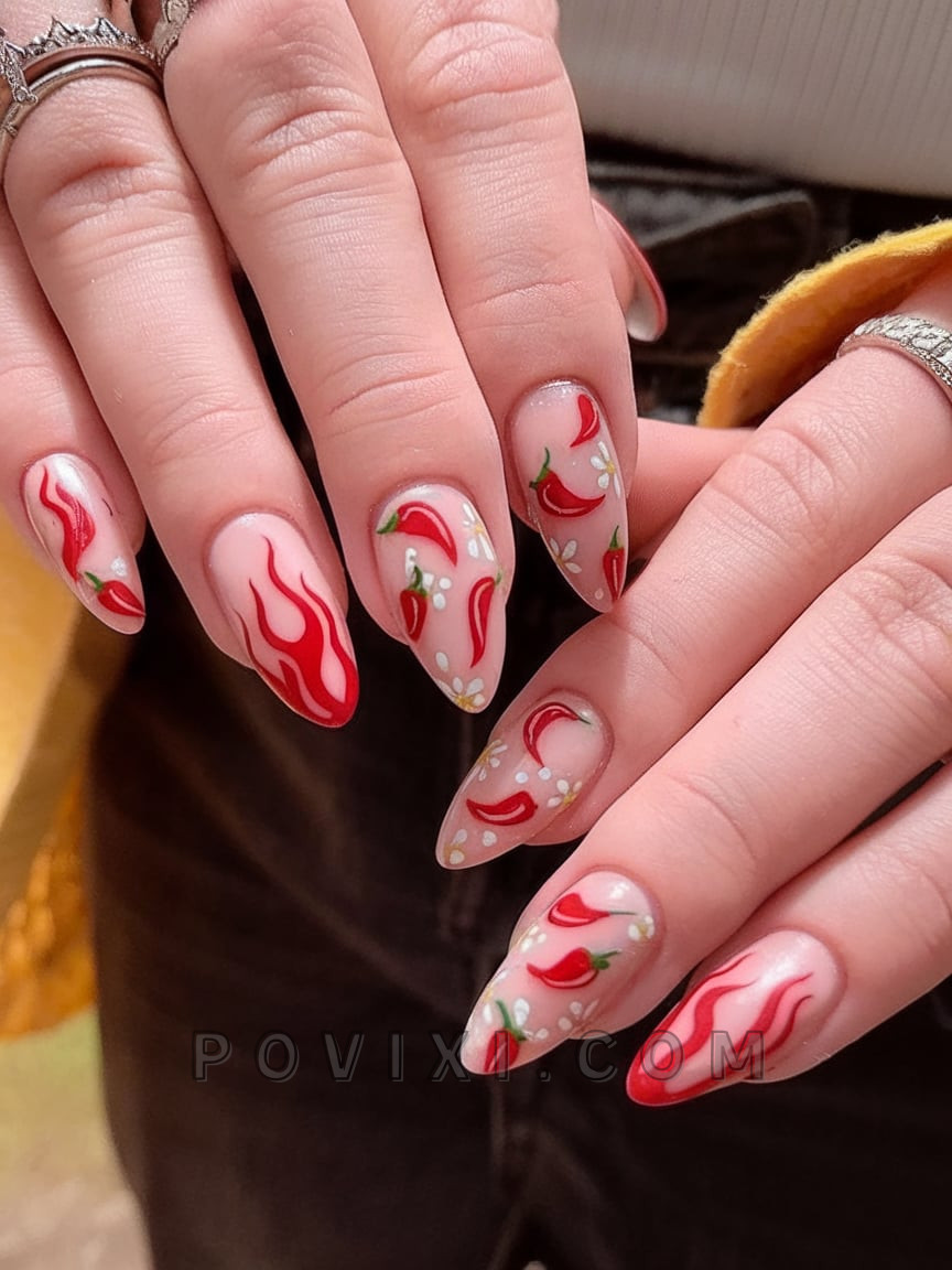 A fun nail design is created with chili peppers next to tiny daisies next to flames in vibrant reds. This design collection is like a summer farmer’s market on your fingertips as it showcases quirky personalities with an artisanal flair. Complete the spicy boho-chic ensemble with a woven bag and tank top accessorized with chunky jewelry.