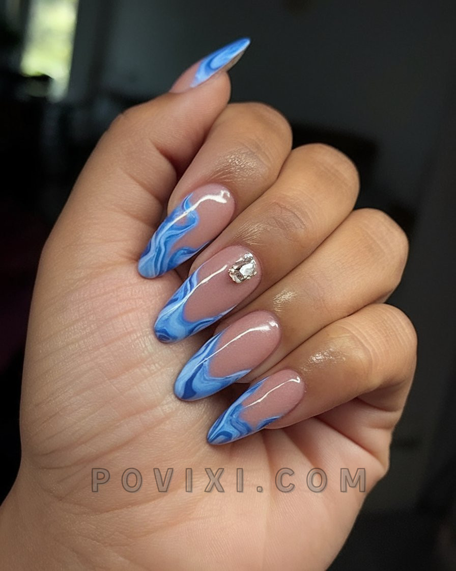 Blue French Tips with heart-shaped designs are always cute. Gel nails decorated with minimalist swirl designs and fragile gemstones create an excellent look for both evening romance and daytime dates. The almond-shaped nail design offers a classic appeal that pairs perfectly with the youthful blue color. Complete the look with a slip dress to achieve perfection for your date.