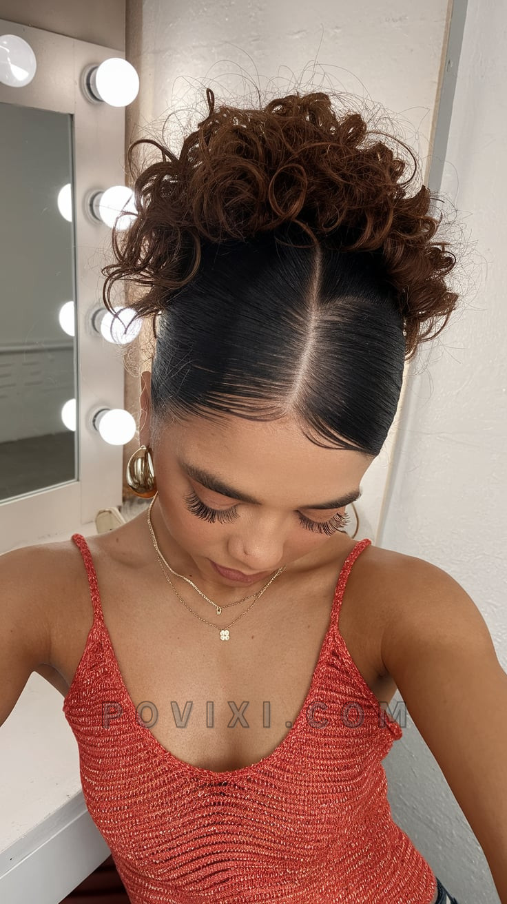Now this is a Hot twist on the classic high puff. Featuring a zig-zag part and tightly brushed sides, the hair is styled up into a high, voluminous puff of natural curls. It’s sleek, bold, and unapologetically fashionable—a statement style for curly hair that works incredibly well for Black women. It’s also a great protective option if you’re in between wash days. Finish with edge control and a shimmer oil for that polished-glow finish.