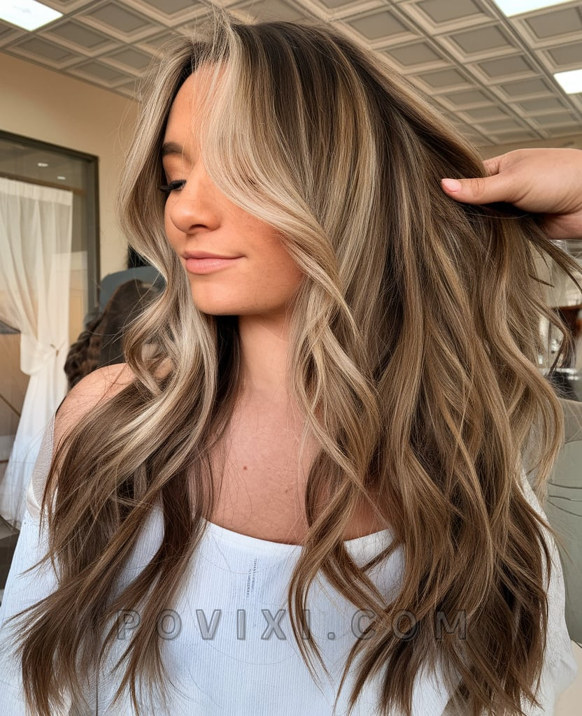 Make a statement this summer with bold, chunky highlights that frame the face in all the right ways. This high-contrast style brings instant dimension to long hair, especially when combined with tousled waves. The key here is to keep the roots natural for a low-maintenance grow-out. Great for those embracing Y2K beauty trends, this look pairs flawlessly with tube tops, oversized hoops, and sun-kissed skin.