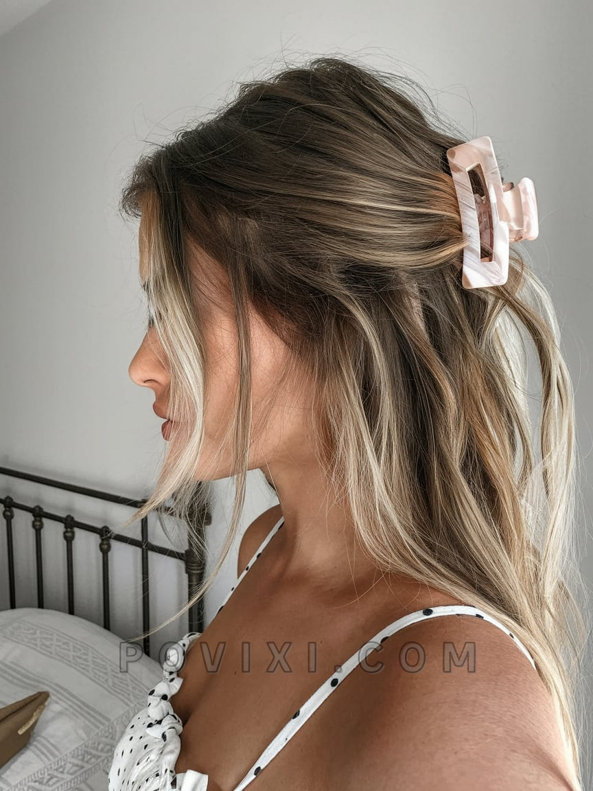 When the heat is on, nothing beats a good clip-up hairstyle. This version keeps it modern and playful with softly teased crown volume and loose, face-framing strands. A large hair claw makes it easy to twist and secure in seconds. Ideal for long or medium-length hair, this summer hairstyle transitions effortlessly from lounging at home to casual outdoor meetups.