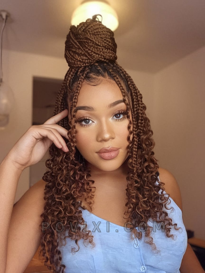 Looking for a cute protective hairstyle for summer 2025? This half-up bun with box braids is stylish and functional. The top knot pulls hair away from the face, while the remaining braids fall beautifully down the back. Ideal for curly or coily textures, this look keeps your strands safe from heat damage while giving you major style points—perfect for travel, pool days, or just owning your vibe.