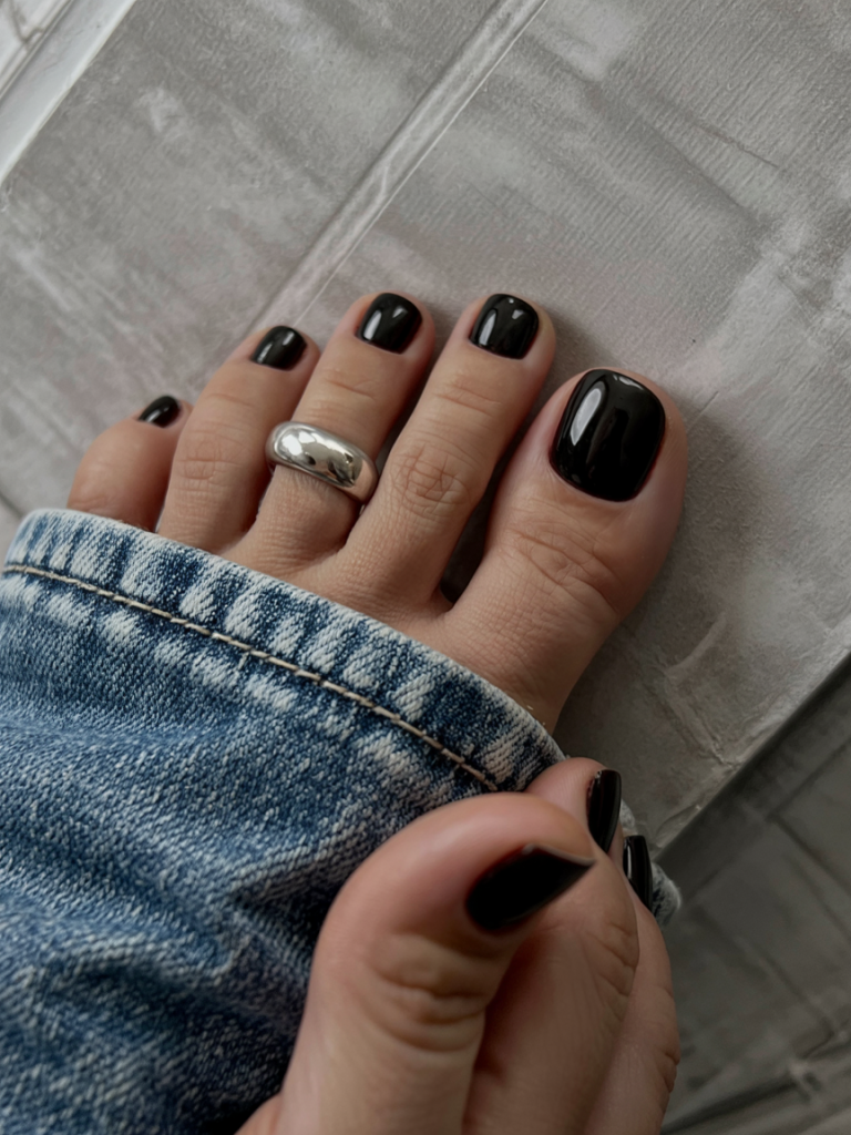 Nothing says “I’ve got this” like jet black toes. This look is sleek, simple, and definitely edgy. It feels cool, contemporary, and a little punk, and it goes with denim and a velvet silk slip dress just as well.