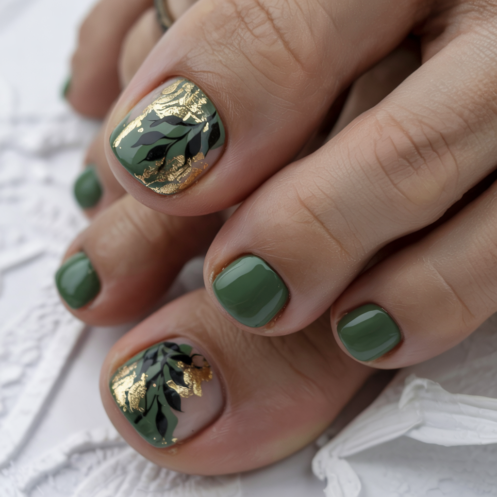 An ideal choice in the realm of autumn pedicure ideas, particularly, among the admirers of earthy colors with a sophisticated touch. Green works on many different skin tones, and the gold cheers the attire up in case of special events. Go with this one when you want something modest with a little bit of turn.