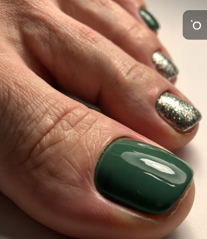 It is a pedicure that gives the impression of autumn glamour in a jewel bow. The deep emerald adds depth whilst the champagne glitter toes resemble a New Year toast. The fine gold effect and small gems accentuation give the golden vane a luxurious touch, reminding of elegance.