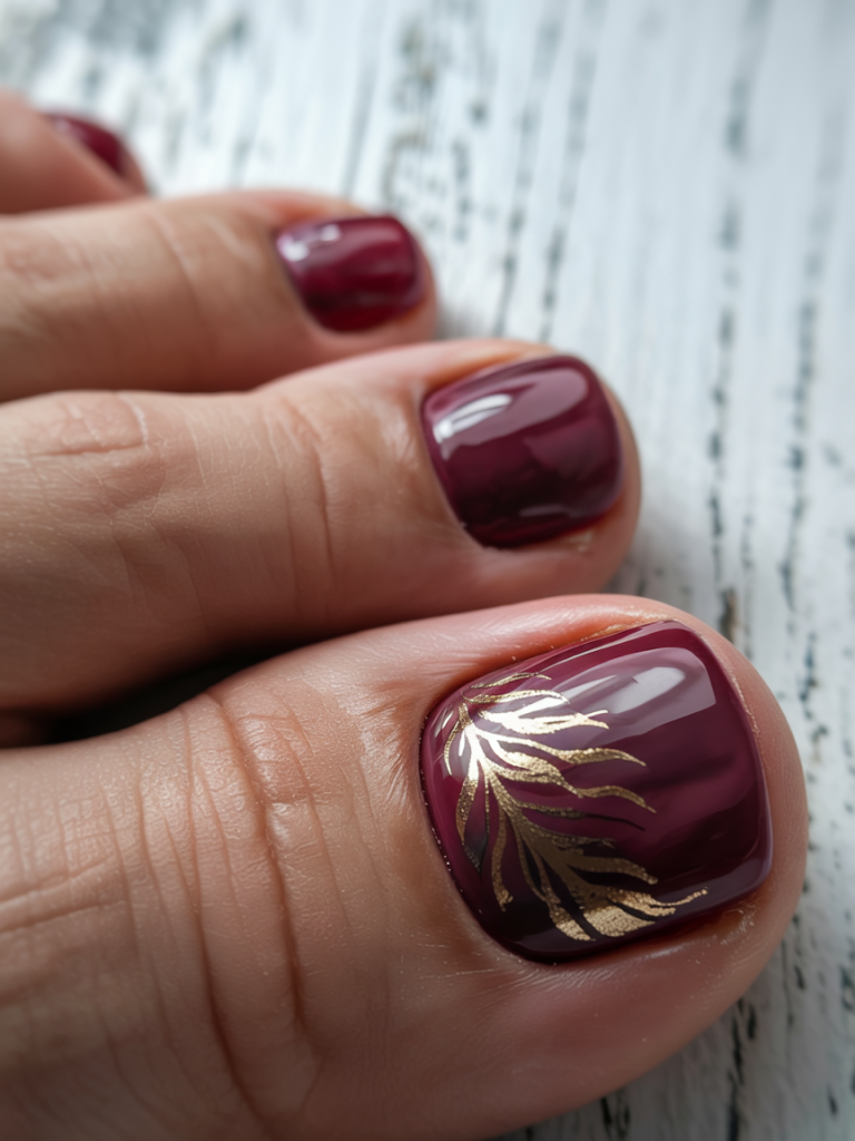 This one is pure elegance. The rich mulberry polish is romantic and kingly yet the fine gold leaf work gives it an artistic touch, even poetic completion. It is the type of pedicures art designs that does not scream and instead whispers luxury.