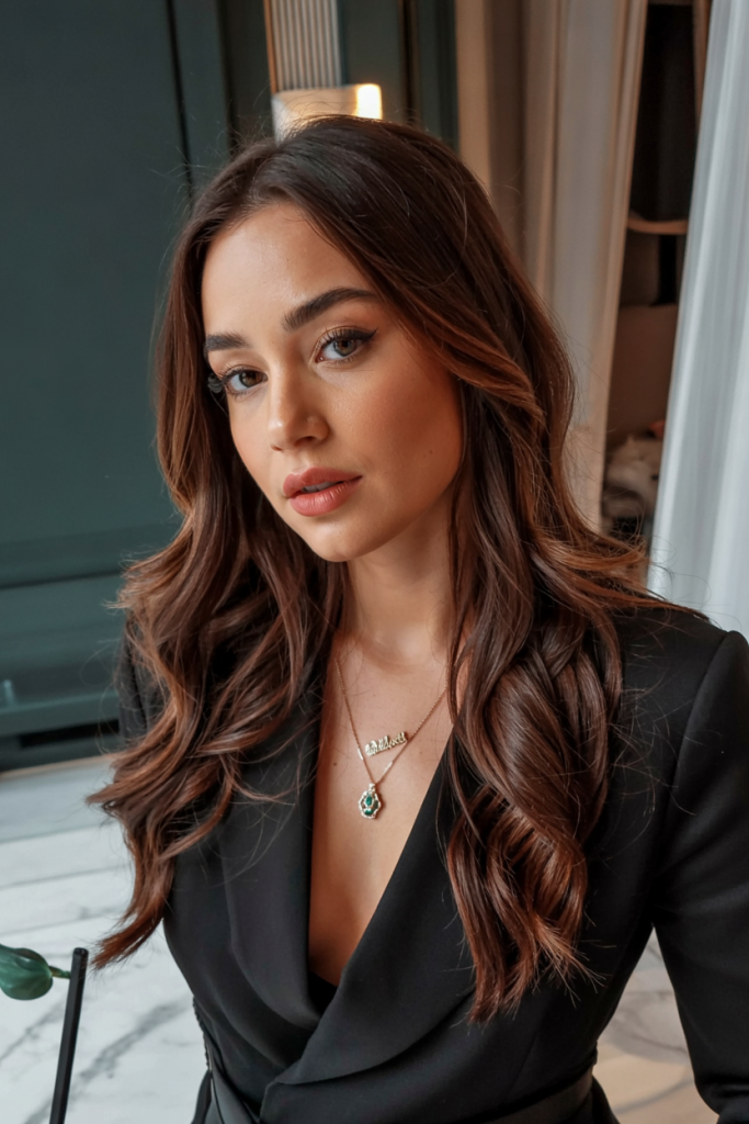 Glossy chocolate-brown hair has a certain air of timelessness, a lack of locational specification, and when parted and dressed in soft waves falls and sparkles with a new freshness that is rather difficult to resist. This shade would work well with fall 2025 being more on the rich yet elegant side but with a touch of a warm nature to it that appeals to every type of skin. The look is quiet confidence that perfectly complements minimal make-up and gold accessories, letting the color speak volumes by itself.