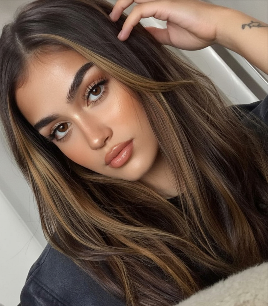 Honey money pieces in brunette hair, offer a quick little boost of brightness to the face with a scattering of light gold strands. The play of contrast feels vivid and yet not harsh, making it one of the most wearable hair color ideas for brunettes 2025. It’s playful, flattering, and easy to love.