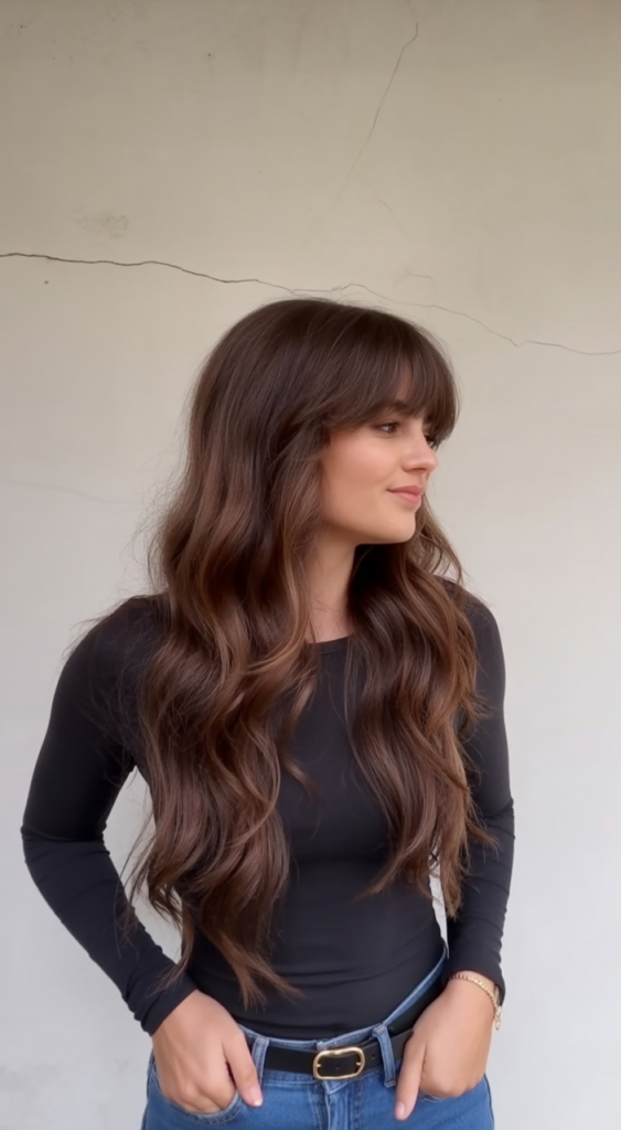 The combination of a chestnut brunette color and full bangs are evergreen. The warm brown color lends a richness and gloss, and bangs create a balance of contour and sweetness to the style. It is an eternal concept that remains to be new in 2025 particularly with longer layered waves.