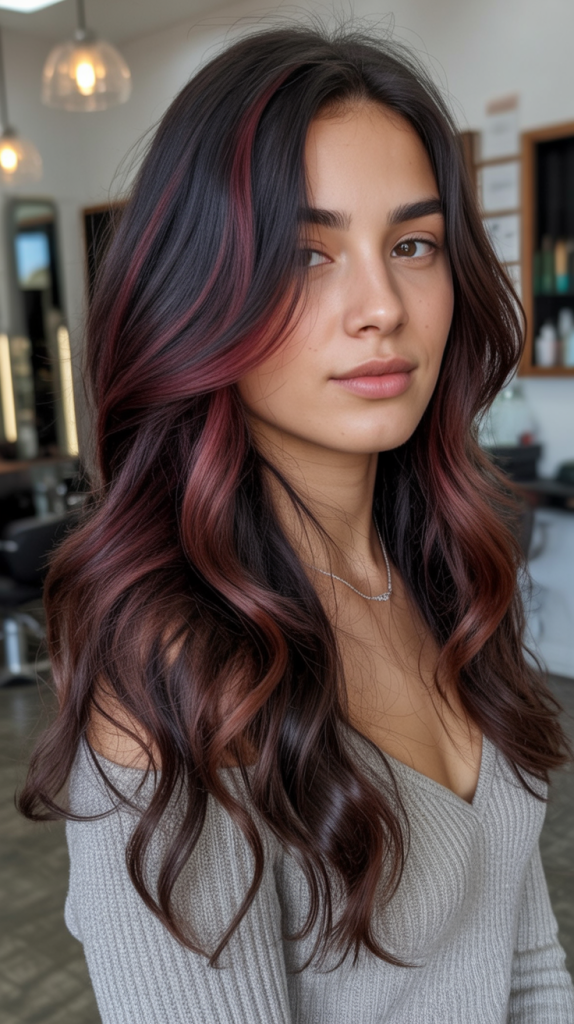 Dark brunette hair with a sultry but refined vibe comes with woven accents of red wine color. The strap peekaboo element establishes a subtle but sufficient amount of drama that does not look too dramatic. It is one of such hair color ideas that can feel fresh in fall 2025, yet it flatters seamlessly.
