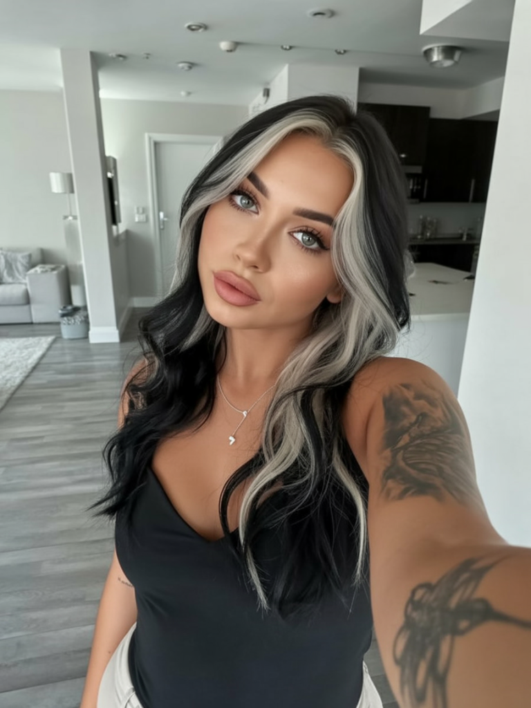 Straight or softly waved hair with the light and dark hair patches remaining defined are the styles this style looks best in. Women of confident, adventurous characters will especially adore this image. Less heat styling ensures that we can keep the silver shine without fading so fast
